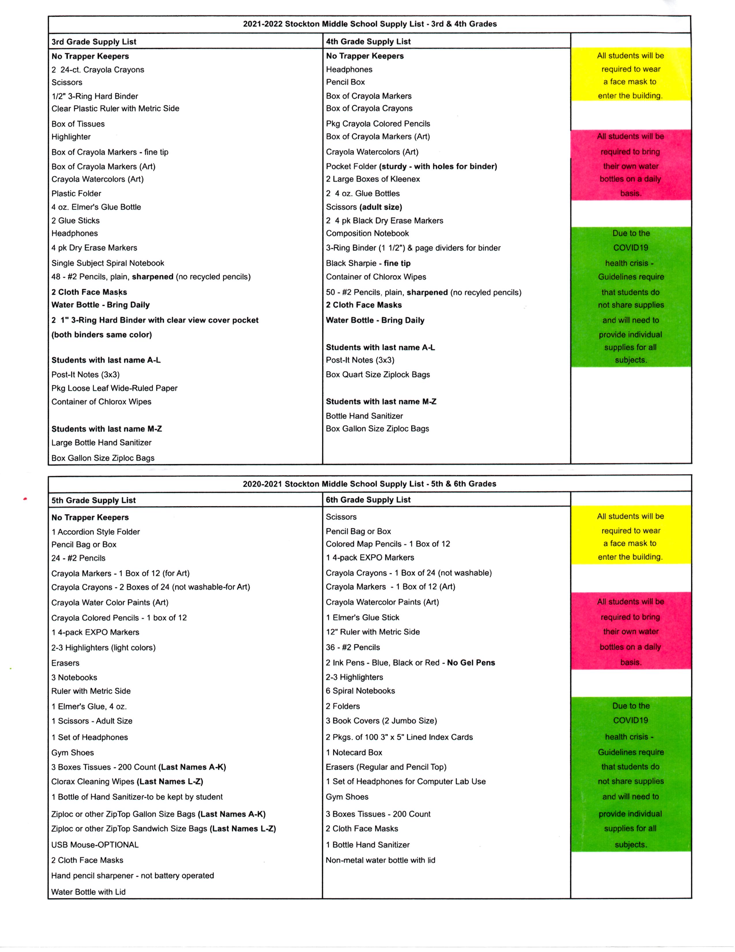 2021-2022 School Supply List - 3rd, 4th, 5th & 6th Grades School supply list for Stockton Middle School, Stockton, IL USA. 2021-2022 Supply List - 3rd, 4th, 5th 6[...] JPG image [688.4 KB]