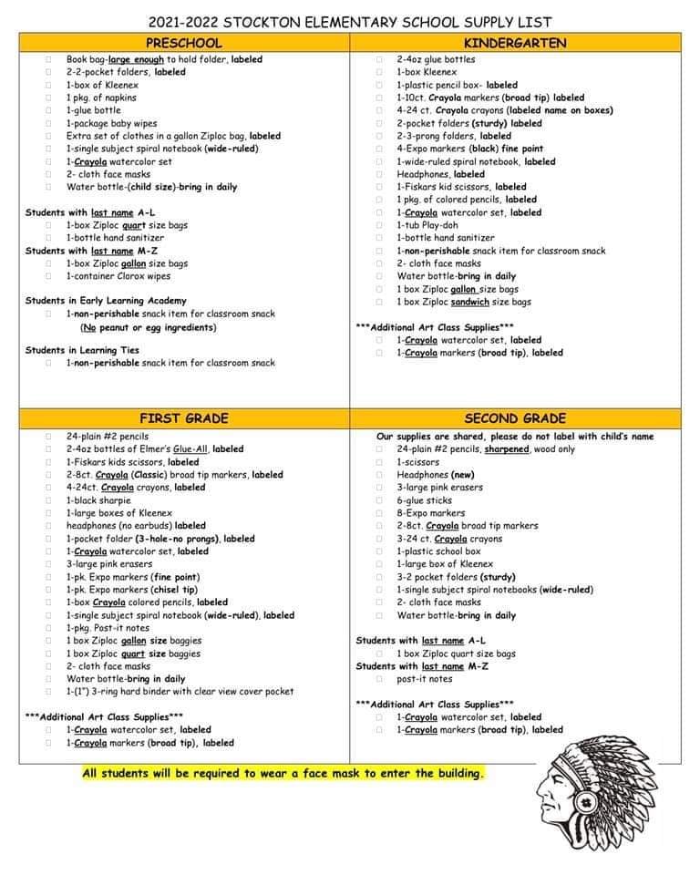 2021-2022 School Supply List - Pre, K, 1st & 2nd Grades School supply list for Stockton Middle School, Stockton, IL USA. 2021-2022 Supply List - Pre, K, 1st 2nd[...] JPG image [101.8 KB]